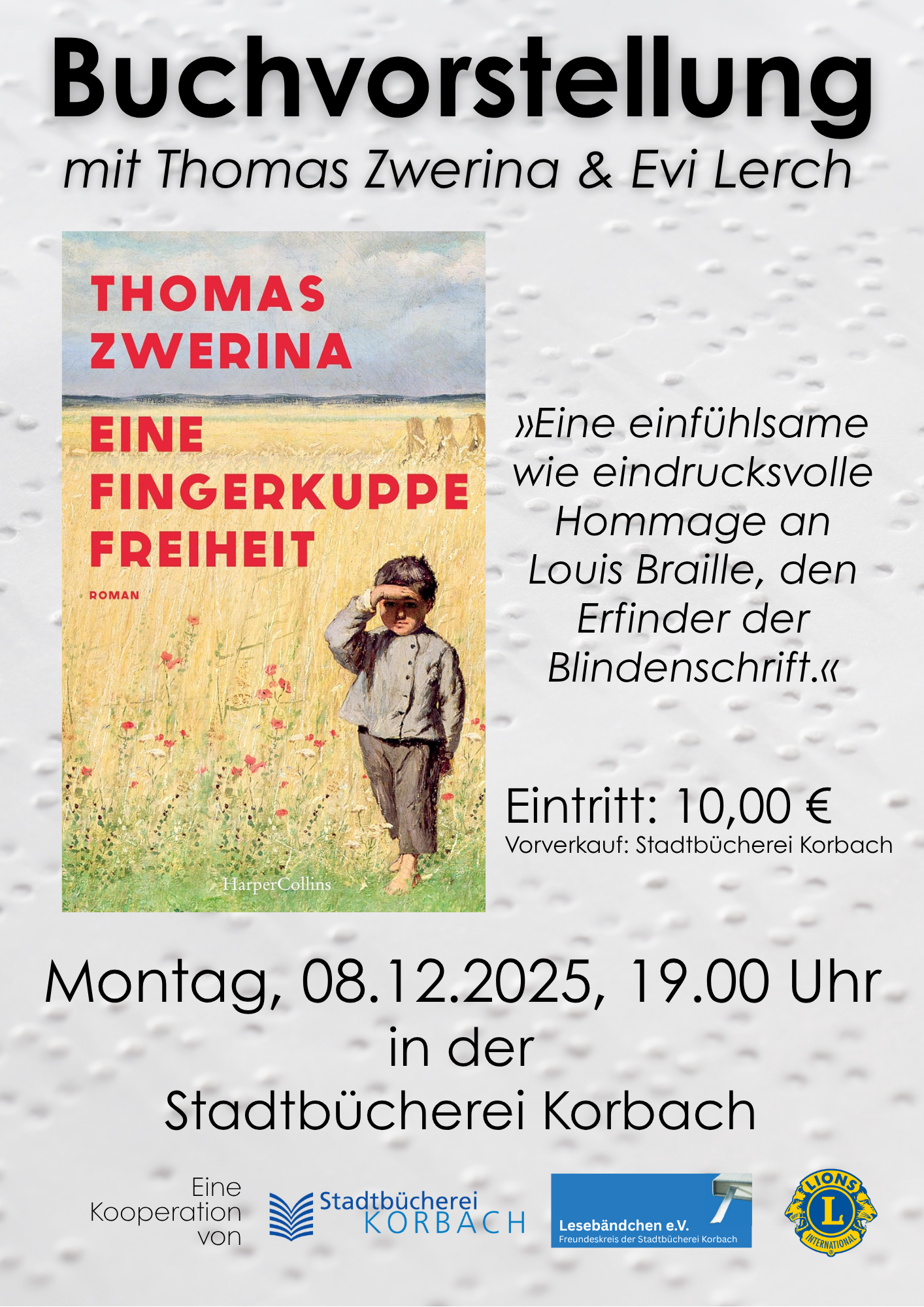 nationaler Blindenanstalt: Ein atmosphärischer Roman über das Leben eines beeindruckenden Mannes, dessen Erfindung so vielen die Welt eröffnet: Louis Braille. Die Liebe zu Literatur und Sprache führte Thomas Zwerina zum Studium der Anglistik und Germanistik an der Uni Gießen. Über die Jahre hat der umtriebige Autor und Komponist Bühnenerfahrung in den Bereichen Literatur, Theater und Musik gesammelt. Gemeinsam mit Evi Lerch bildet Zwerina das musikalische Duo "The Cellular Fools". 2018 ist Thomas-Zwerina vollständig erblindet, was ihn aber als Kunstschaffenden nicht müde werden lässt. Zurück Bearbeiten |