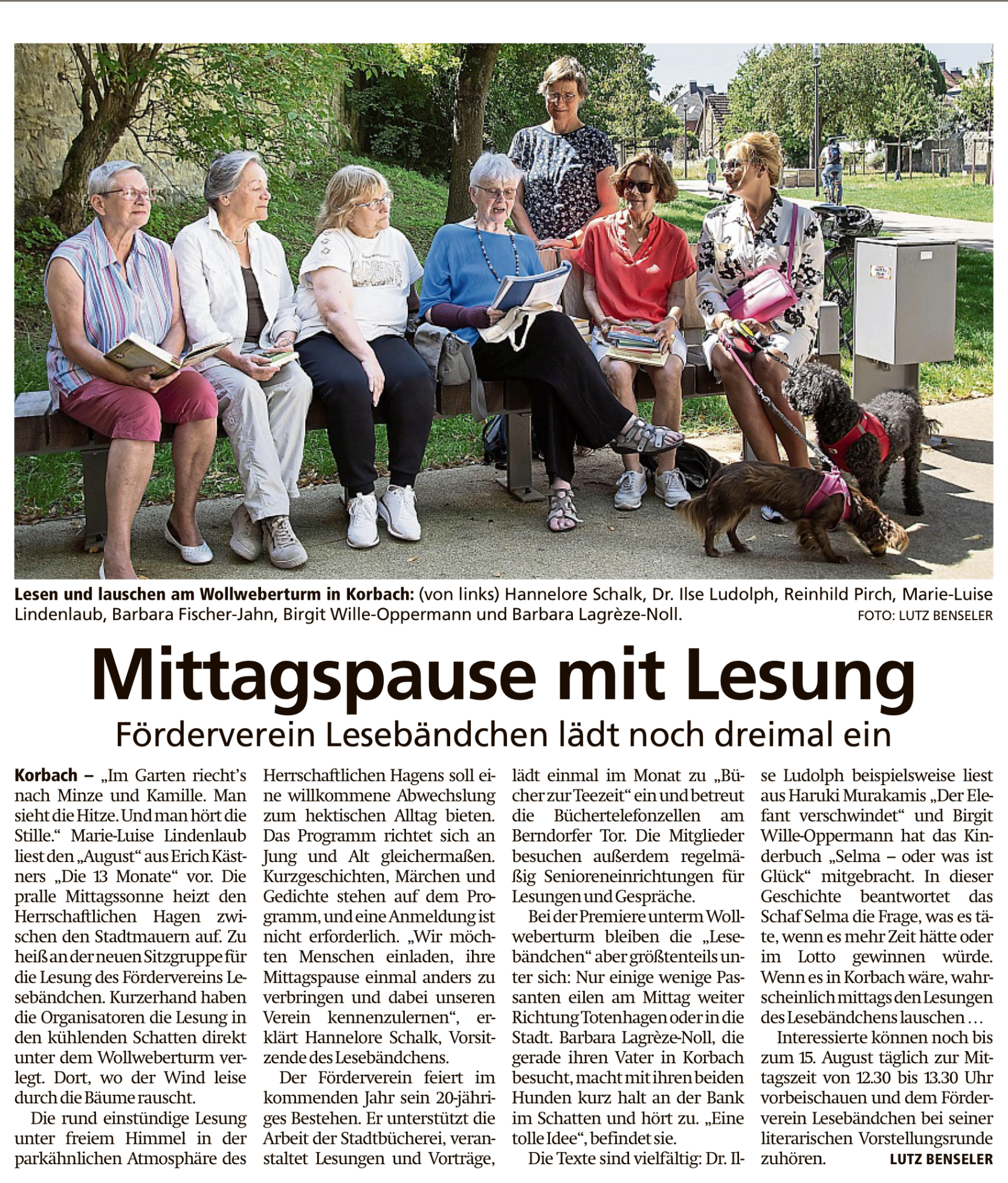 Zum NachlesenFörderverein Lesebändchen lädt noch dreimal einKorbach - „Im Garten riecht’s nach Minze und Kamille. Man sieht die Hitze. Und man hört die Stille“ Marie-Luise Lindenlaub liest den „August“ aus Erich Kästners „Die 13 Monate“ vor. Die pralle Mittagssonne heizt den Herrschaftlichen Hagen zwischen den Stadtmauern auf. Zu heiß an der neuen Sitzgruppe für die Lesung des Fördervereins Lesebändchen. Kurzerhand haben die Organisatoren die Lesung in den kühlenden Schatten direkt unter dem Wollweberturm verlegt. Dort, wo der Wind leise durch die Bäume rauscht. Die rund einstündige Lesung unter freiem Himmel in der parkähnlichen Atmosphäre des Hertschaftlichen Hagens soll eine willkommene Abwechslung zum hektischen Alltag bieten. Das Programm richtet sich an Jung und Alt gleichermaßen. Kurzgeschichten, Märchen und Gedichte stehen auf dem Programm, undeine Anmeldung ist nicht erforderlich. „Wir möchten Menschen einladen, ihre Mittagspause einmal anders zu verbringen und dabei unseren Verein kennenzulernen“, erklärt Hannelore Schalk, Vorsitzende des Lesebändchens. Der Förderverein feiert im kommenden Jahr sein 20-jähriges Bestehen. Er unterstützt die Arbeit der Stadtbücherei, veranstaltet Lesungen und Vorträge, lädt einmal im Monat zu „Bücher zur Teezeit“ ein und betreut die Büchertelefonzellen am Berndorfer Tor. Die Mitglieder besuchen außerdem regelmäßig Senioreneinrichtungen für Lesungen und Gespräche. Bei der Premiere unterm Wollweberturm bleiben die „Lesebändchen“ aber größtenteils unter sich: Nur einige wenige Passanten eilen am Mittag weiter Richtung Totenhagen oder in die Stadt. Barbara Lagréze-Noll, die gerade ihren Vater in Korbach besucht, macht mit ihren beiden Hunden kurz halt an der Bank im Schatten und hört zu. „Eine tolleIdee“, befindet sie. Die Texte sind vielfältig: Dr. Ilse Ludolph beispielsweise liest aus Haruki Murakamis „Der Elefant verschwindet“ und Birgit Wille-Oppermann hat das Kinderbuch „Selma - oder was ist Glück“ mitgebracht. In dieser Geschichte beantwortet das Schaf Selma die Frage, was es täte, wenn es mehr Zeit hätte oder im Lotto gewinnen würde. Wenn es in Korbach wäre, wahrscheinlich mittags den Lesungen des Lesebändchens lauschen... Interessierte können noch bis zum 3. August täglich zur Mittagszeit von 12.30 bis 3.30 Uhr vorbeischauen und dem Förderverein Lesebändchen bei seiner literarischen Vorstellungsrunde zuhören. LUTZ BENSELER |